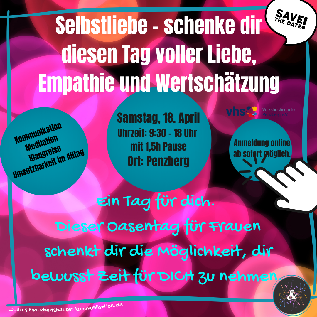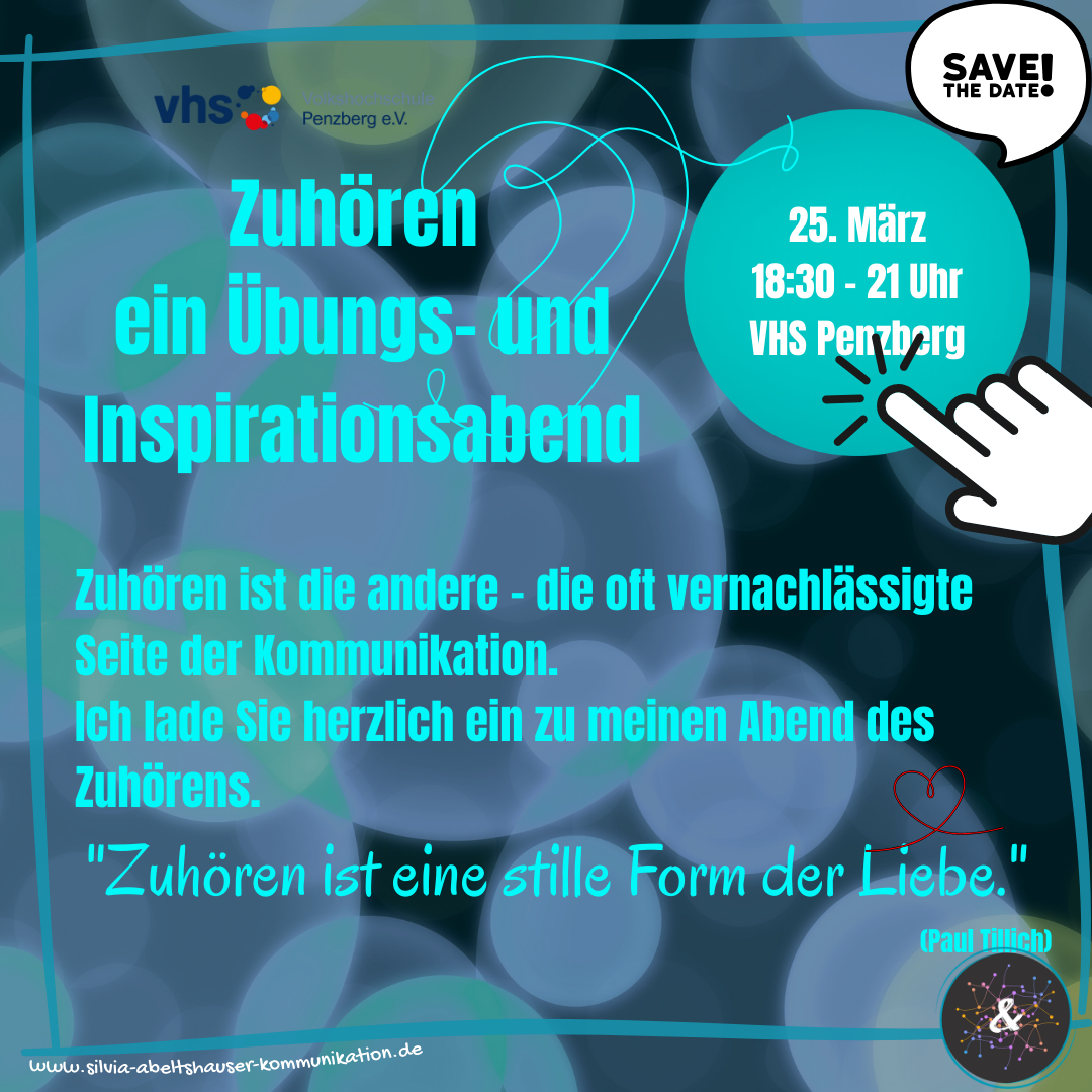 "Zuhören ist eine stille Form der Liebe." (Paul Tillich)Wir werden die verschiedenen Arten des Zuhörens erforschen und auch üben. Sie erleben, wie es sich anfühlt, wirklich gehört zu werden und dadurch in Verbindung zu kommen. Außerdem erfahren Sie, wie Sie gut für sich sorgen können, wenn jemand Sie nicht so hört, wie Sie es in dem Moment brauchen, und welche Gründe es gibt, warum wir manchmal nicht so zuhören (können), wie es in dem Moment gebraucht wird.Ich freue mich auf unsere Begegnung und unseren Austausch.